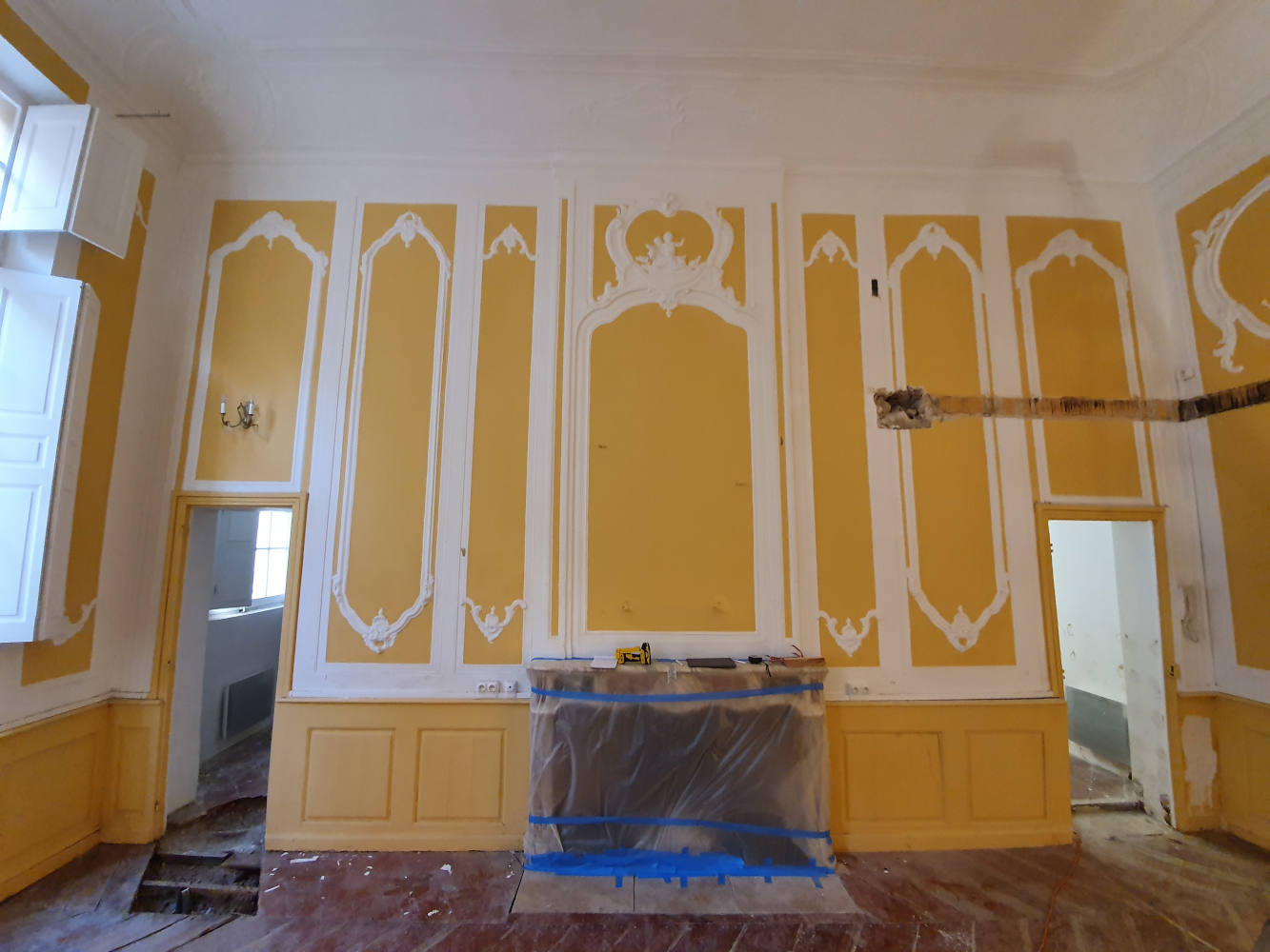 Diagnostic des décors de gypserie – essais de dégagement des repeints – établissement d’un protocole d’intervention avec chiffrage pour restauration des peintures et ornements.