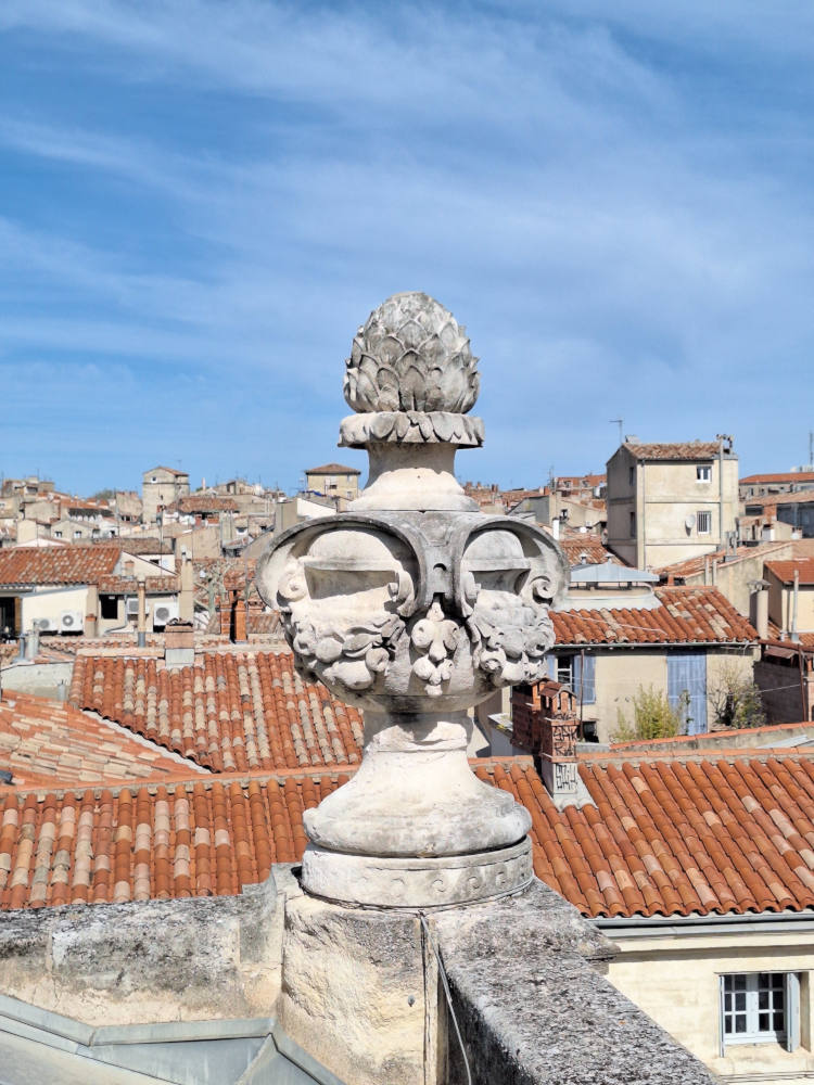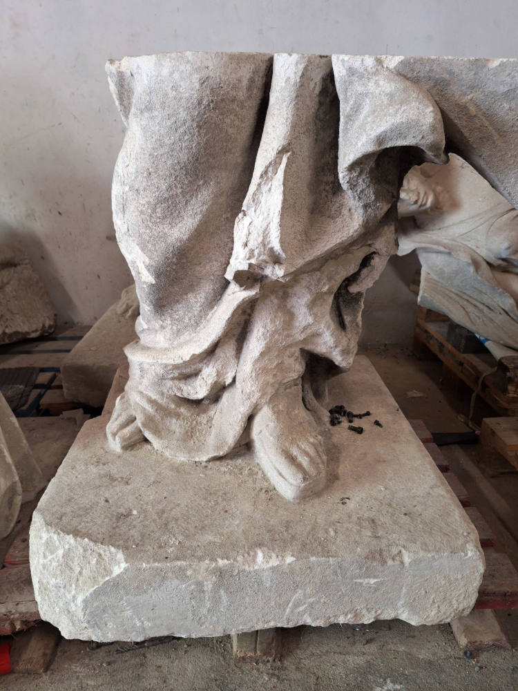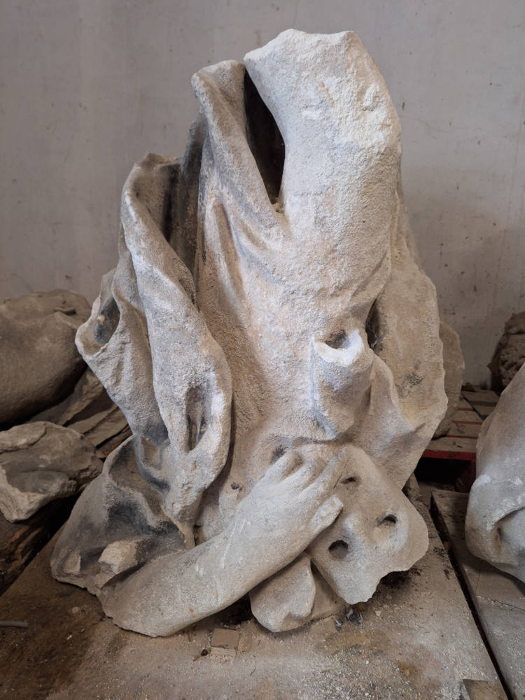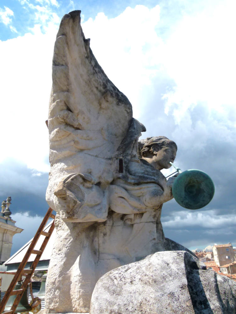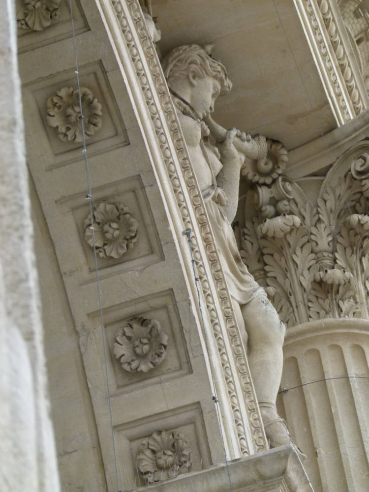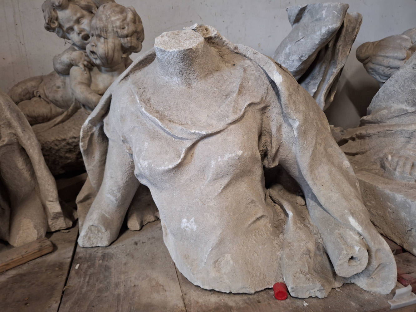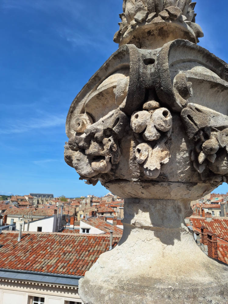 Etude complémentaire des sculptures et ornementations sculptées en présence sur les façades et toitures : diagnostics des ornements non traités en 2021, affinement des protocoles en phase APS, APD – quantification des pierres à changer – proposition d’une restitution à neuf des 4 allégories du sculpteur biterrois P-A Injalbert (Façade principale) – étude de faisabilité à partir des fragments conservés en réserve – chiffrage de l’ensemble.